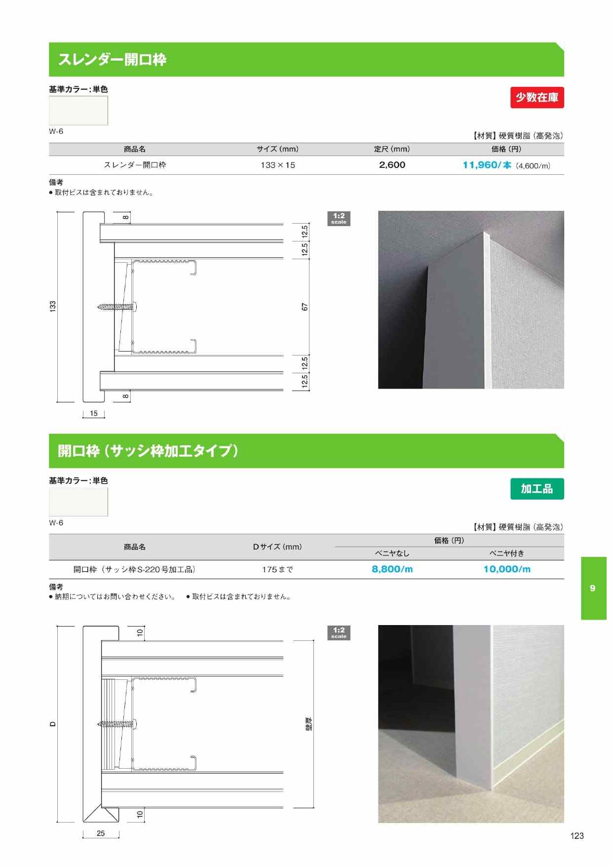 | 特長 | 見付幅15mm、スマート設計、軽量・高耐久、高発泡樹脂、定尺2,600mm |