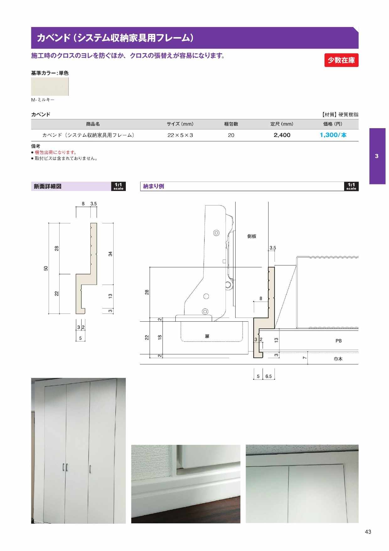 収納家具用フレーム|カベンド 22×5×3mm 色:M- ミルキー L2400mm 20本入り
