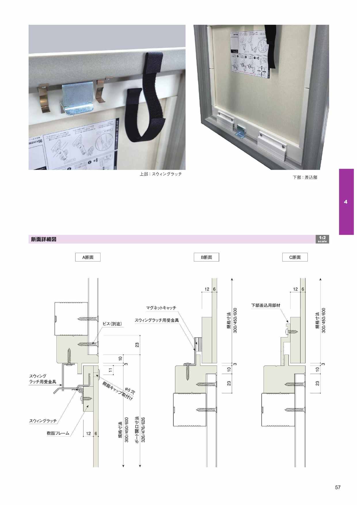 - 開閉方向は必ず“上開き”指定。安全なスウィングラッチ構造