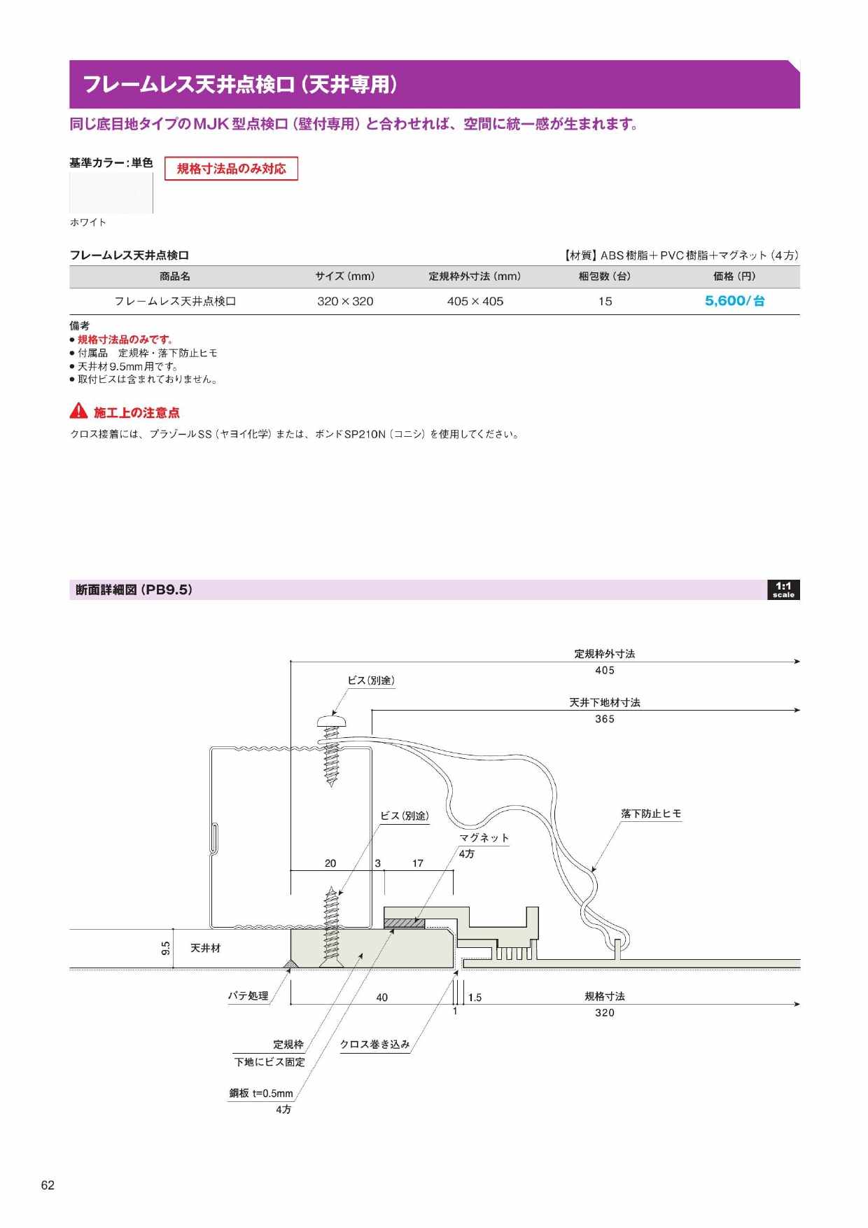 | 備考 | 定規枠・落下防止ヒモ付属/取付ビス別売/クロス接着剤指定あり(プラゾールSS・ボンドSP210N)/MJK型点検口と組合せで統一感UP |