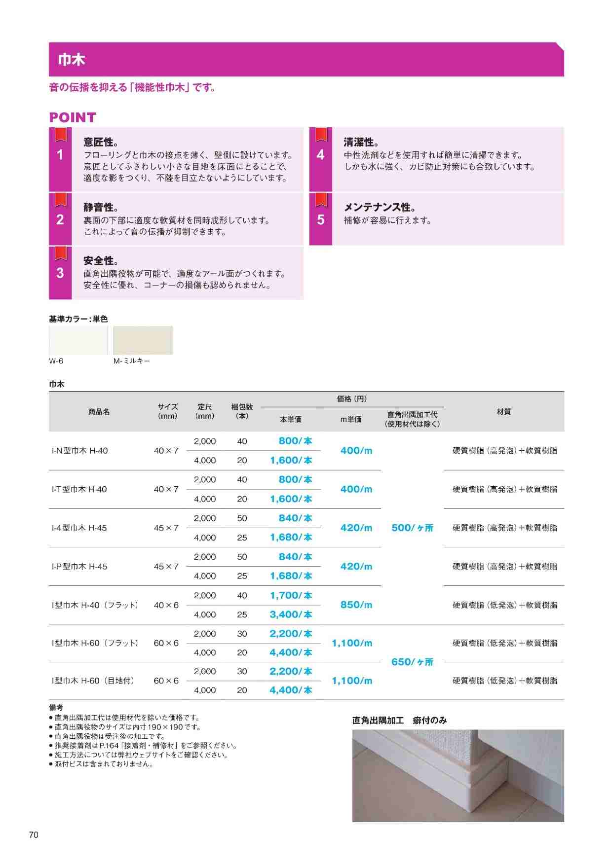 現場の美観・静音性を両立する「I-P型巾木 H-45 4000」。プロ業者様向けの高機能防音巾木として、集合住宅や商業・公共施設で多数採用されています。