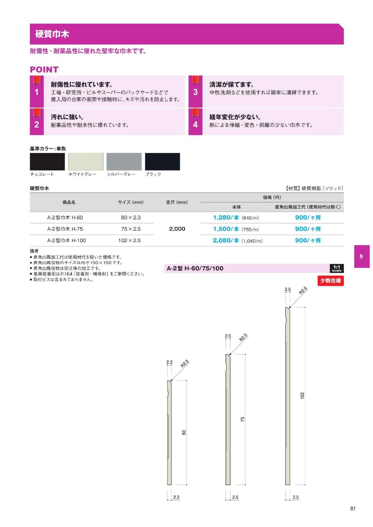 「A-2型巾木 H-100」は、工場・研究所・ビル・商業施設のバックヤードなどで採用される、幅広タイプの耐傷・耐薬品性硬質巾木。台車や機器の衝突によるキズや汚れを防止し、清潔で長持ちする現場環境を実現します。